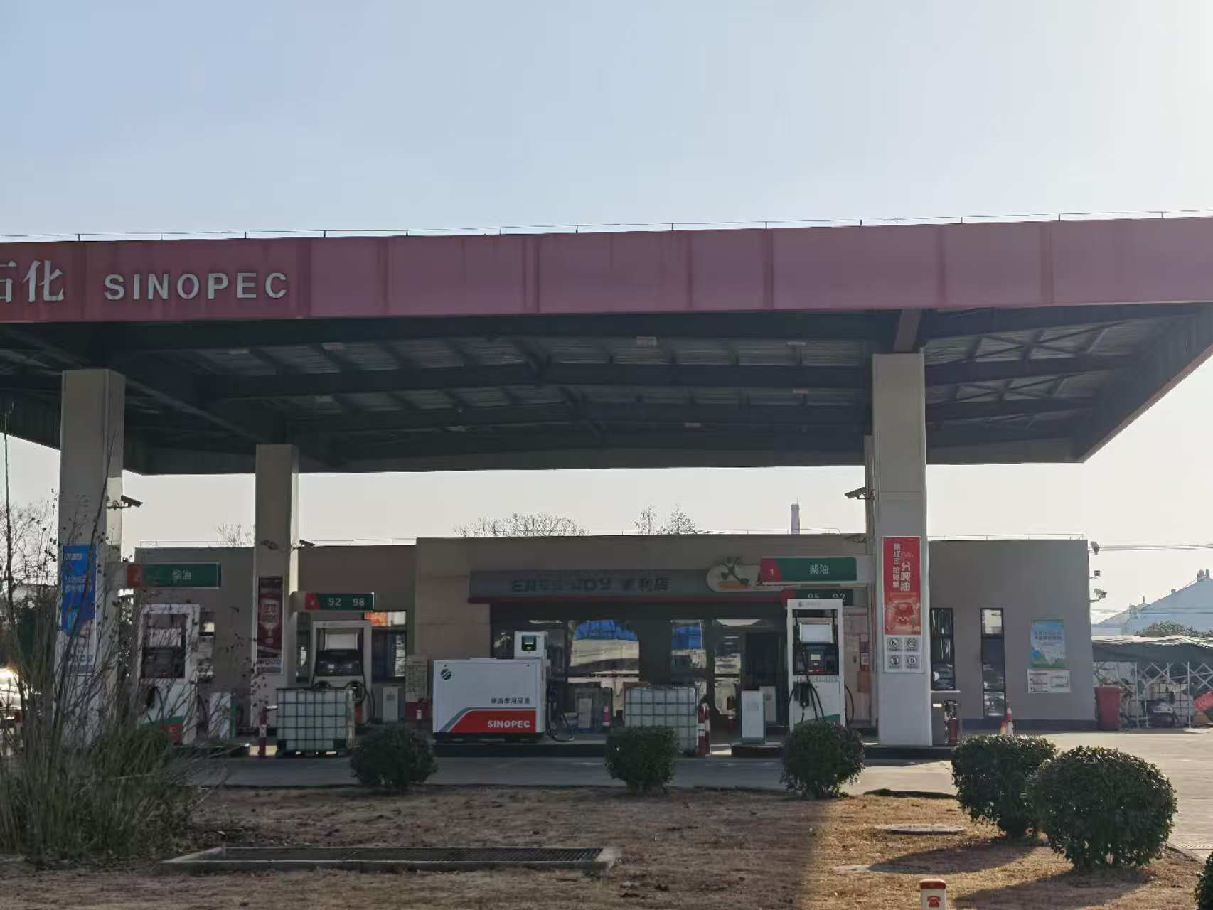 中国石化销售股份有限公司江苏无锡宜兴第十九加油站位于宜兴市周铁镇前观村,占地面积为2596.3㎡,土地产权系自有,站房面积为173㎡,加油岛罩棚面积276㎡(为投影面积折半),建筑物产权系自有。宜兴第十九加油站设有埋地卧式储油罐4只,设置在埋地储罐区,自西向东依次为1只30m³0#柴油罐、1只30m³92#汽油罐、1只30m³95#汽油罐和1只30m³98#汽油罐。根据《汽车加油加气加氢站技术标准》(GB50156-2021)第3.0.9条规定(柴油折半)计算,本加油站计算总容量为105m³,加油站属二级加油站。加油站设税控加油机4台,2台4枪汽油加油机,2台2枪柴油加油机,故加油枪总计12把。加油站另设一台柴油尾气处理液加注机(防爆),并附有1把加注枪。 |